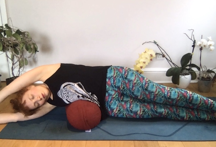 - Place a yoga brick or a rolled-up towel or blanket under your upper back (ladies, align it with your bra strap area) so that your chest is slightly lifted but the crown of the head is still on the floor. If this feels too intense, adjust the height of your prop (so unroll your blanket so it’s not so big or dense).
