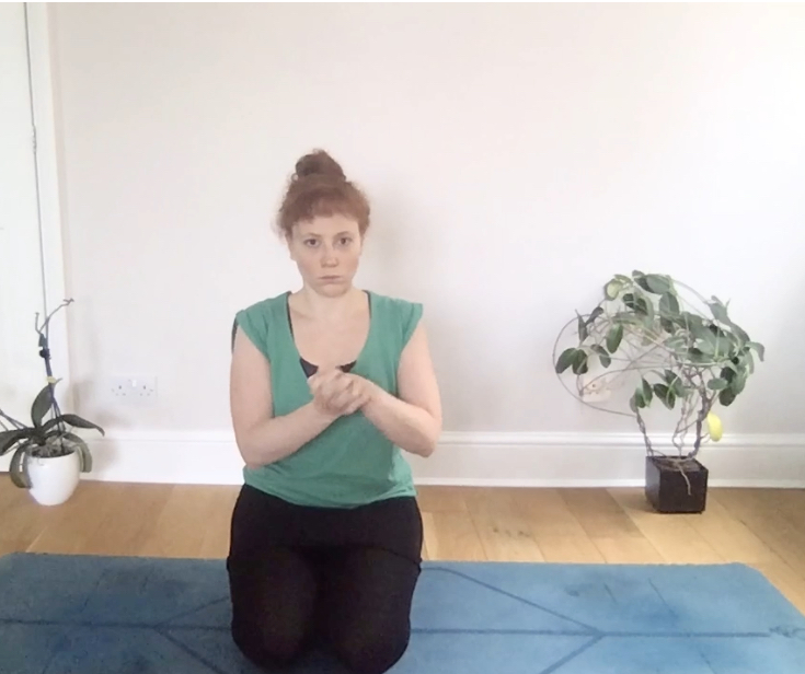 Starting in a comfortable seated position (on the floor or even seated on a chair), bring the palms of the hands together and interlace the fingers. Then start making figures of eight with your wrists. You should be mainly bending your wrists here, with the rest of your arm staying steady (imagine what an unwound skein of yarn looks like – that’s what we want). Repeat for around 30 seconds.