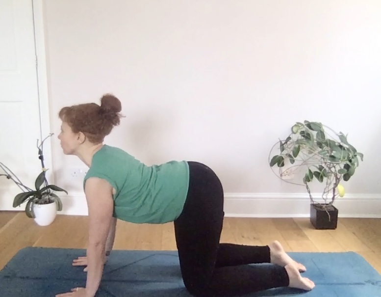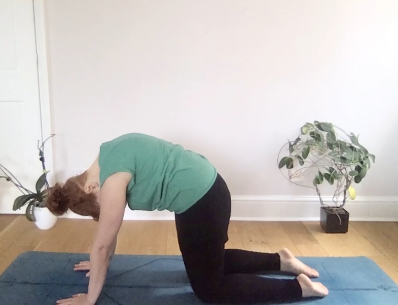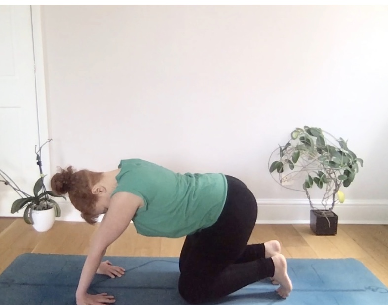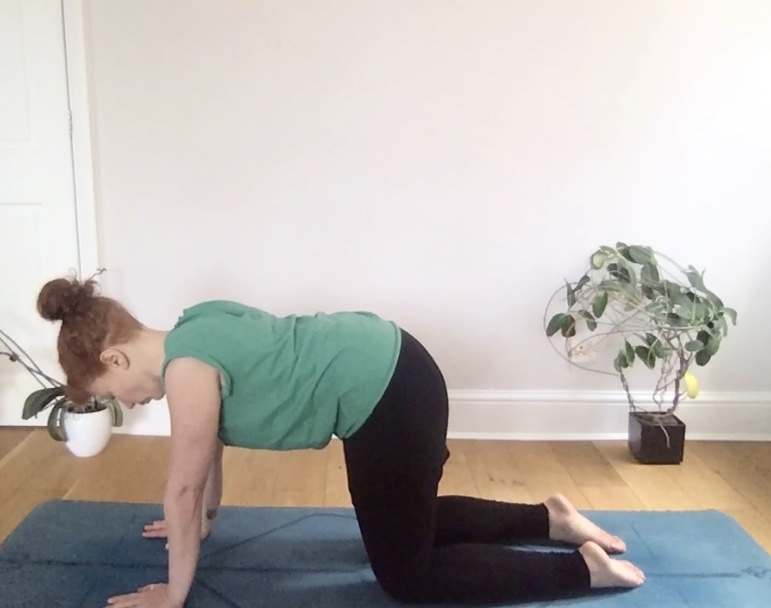 Ok, you probably spend a lot of your time knitting hunched over (I know I do) – so let’s bring some movement into the spine and release some tension. Come into a four-point kneeling position, with your wrists under your elbows and your knees under your hips. Spread your fingers really wide like starfish.