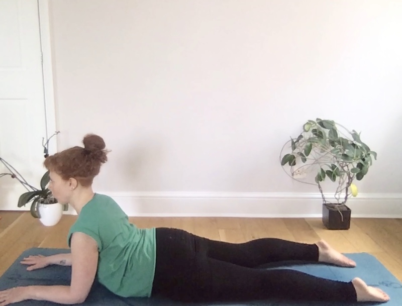 Almost there! Come to lie on your belly, then slowly lift your chest up and place your forearms on the ground, elbows stacked under your shoulders and finders spread wide. Feel an opening in the front of the body and a strengthening in your back muscles. You can keep your face facing forwards or relax the head down to release the neck. Hold for 10 breaths.