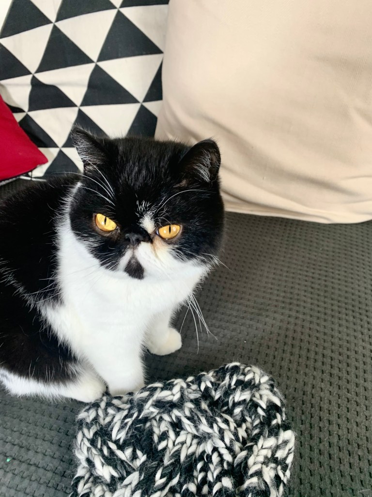 Then I saw this yarn. It’s completely inappropriate for something with texture, as the cables don’t show very well. But it looks like kitty. It looks like kitty. I had to have it. And thus was born the kitty cowl.
